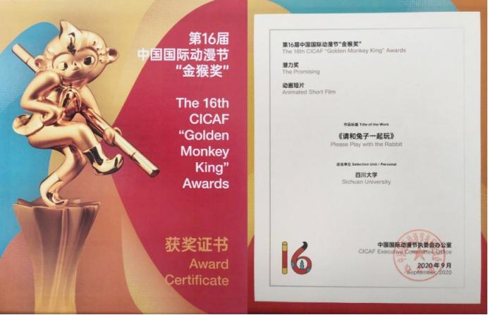 2020年9月29日晚,第十六届中国国际动漫节“金猴奖”颁奖仪式在杭州举行。公司2019级设计学硕士研究生王伟成创作的短片《请和兔子一起玩》获得动画类潜力奖,王伟成受邀赴杭州参加了金猴奖颁奖典礼,中央广播电视总台党组成员、副台长蒋希伟,浙江省委常委、杭州市委书记周江勇,杭州市委副书记、市长刘忻等领导出席颁了奖仪式并为获奖作品代表颁奖。