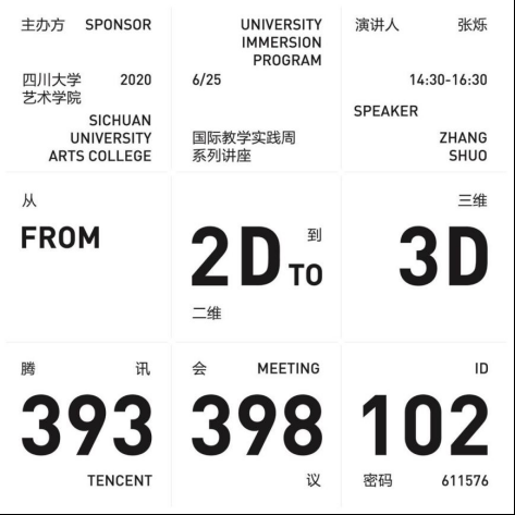 2020年6月25日,太阳集团2007开展了第二期国际教学实践周系列讲座。本次讲座因疫情缘故在腾讯会议线上举办,邀请张烁老师围绕“从二维到三维(Between 2D And 3D)”的主题进行讲授,本次讲座不仅拓展了同学们的知识面,并且打开了同学们的国际视野。