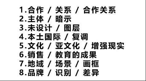 这些关键词被张烁老师分成八组进行解读,结合他个人项目的图片及有趣的工作故事,帮助同学们加强了对平面、空间以及美感的认知。这八组关键词分别为:1.合作/关系/合作关系(Cooperative/Relationship/Cooperative relationship);2.主体/暗示(Design for?/A hint);3.未设计/图层(Not design?/layers);4.本土国际/复调(Localinternational/Polyphony);5.文化/亚文化/增强现实(Culture/Sub-culture/Surplus reality);6.销售、教育的成果(Sales, results of education);7.地域/场景/画框(Local/Context/Frame);8.品牌/识别/差异(Brand/Discern/Diversity)