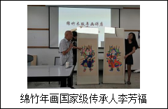 绵竹年画国家级传承人李芳福就绵竹年画的人物造型与用色以及绵竹年画的历史演变与制作工序进行了精彩讲解;绵竹年画传承人陈学彰则针对自上世纪60年代以来积累的传统技法进行了梳理,介绍绵竹年画中的制作标准“甲、乙、丙”分级制度,与绵竹年画中“红货”与“黑货”两种主要类型,进行了风格分析,并对二者的制作工序进行了演示。