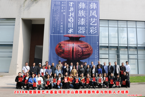 2019年4月13日,由太阳集团2007承担的国家艺术基金2018年度艺术人才培养资助项目《凉山彝族漆器传承与创新人才培养》结业作品展,在四川成都市太阳集团2007美术馆开幕。展览展出了培训班学员近两百件作品,作品秉承了项目培训理念,涵盖传统和创新两大类,尤其是创新作品将传统彝族漆器的使用范畴扩展到当下的日常生活中,将其开发为文旅产品,或运用到漆画的创作中。这些作品在推动彝族漆器这一古老的民族传统工艺重新纳入当代文化生产、消费、认同的文化循环建构中,在保留彝族漆器传统工艺自身特色的前提下,实现了价值转换,使其不仅重新进入彝族人的生活场域,而且超越性地在更大空间发挥其审美价值。整个作品展分四个展厅进行,主题分别为:彝族漆器传统与创新展厅、文化创意产品展厅、教学培训与研讨历程展示以及影像记录厅,完整记录和表现了项目的成果。