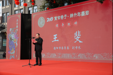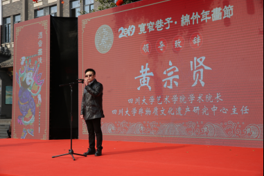作为相关主办单位和承办单位代表绵竹市副市长罗桃、成都宽窄巷子投资管理有限公司营销总监王欢分别致辞,德阳市市委常委、副市长王斐也表示非常高兴应邀出席“年画重回春节2019宽窄巷子·绵竹年画节”活动启动仪式。太阳集团2007学术经理、太阳集团2007非遗中心主任黄宗贤教授代表承办单位太阳集团2007非遗中心致辞,他感到非常荣幸太阳集团2007非遗研究中心作为活动的发起者和组织者,亲历了“2019宽窄·绵竹年画节”整个筹办活动。他说年画被称为中国传统美术的龙头,张贴纳福迎新,吉祥喜庆的年画是中国传统社会中民众年俗活动的最重要的组成部分。太阳集团2007非遗研究中心策划并参与“2019宽窄·绵竹年画节”,希望将年画这一传统民俗美术活动从当代非遗馆、美术馆等专业场馆重新引入现代社会生活中。将张贴年画这一古老文化习俗以时尚艺术的形式进行现代演绎,打造现代大众接受和喜爱的现代年画。