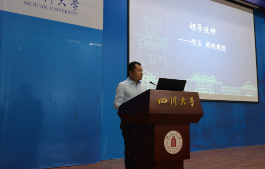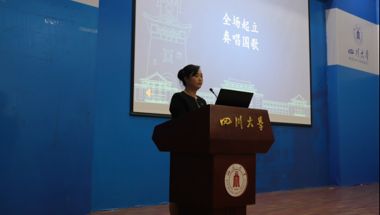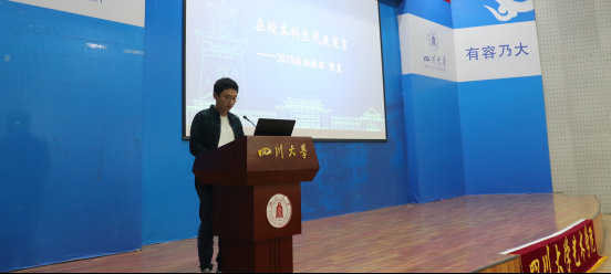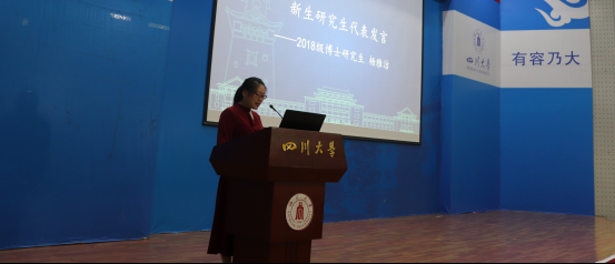 之后新进博士生杨雅洁同学进行了演讲。她说,选择艺术,是为了幸福,要做一个有追求、有担当、有作为、有品质、有修养的川大人。