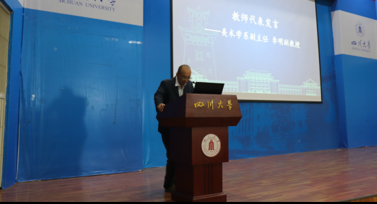 接着,美术学系李明副教授做为教师代表进行了讲话。李老师提到,同学们升入大学,切忌掉以轻心,要继续枕戈待旦拼搏学习,利用川大这样优秀的平台在自己的专业内去探索、去发现,真正成长为一个具有“深厚人文底蕴,扎实专业知识,强烈创新意识,宽广国际视野”的“国家栋梁和社会精英”。