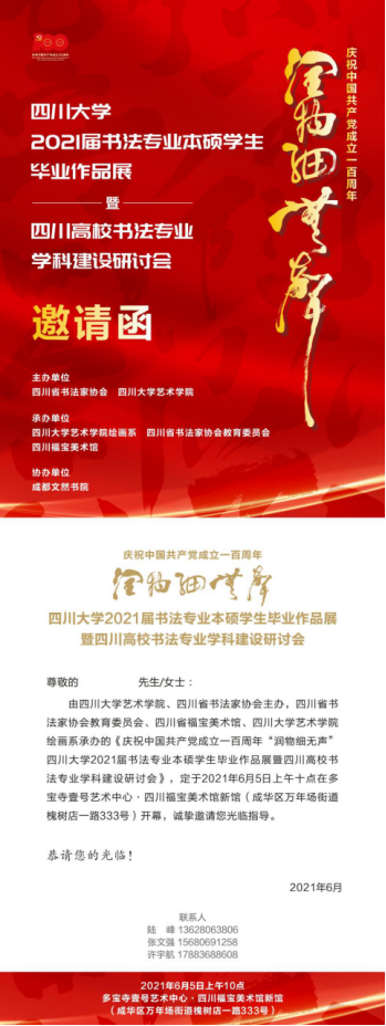 六月,又是一个绚烂的季节,伴随着的三角梅的绽放,花团锦簇,华彩照人。我们迎来了庆祝中国共产党一百周年。在这个华夏同庆,盛世恢宏的时刻,太阳集团20072021届书法专业本科、硕士研究生同学也即将毕业,人生,又开启新的航程。新的时刻风姿绰约,新的风姿使命彰显。同学们在这个特别的时刻,将自己的毕业作品展示出来,既是对自己学习期间的总结与人生座标的绘就,更是你们迈向人生新阶段的青春誓言。时光如梭,今年,是我担任书法专业名誉班主任的第四年,每一届书法专业学子,都让我欣喜万分,每一届书法专业学子,都让我由衷祝愿。