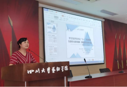 首先,杨老师以“扬伟大建党精神 做新时代先锋力量”为切入点带领大家学习了习近平总书记‘七一’讲话精神。她谈到,文化文艺工作、哲学社会科学工作是‘培根铸魂’的工作,当代研究生同学们应当积极传承红色基因、赓续红色血脉,立足本职,努力学习,在实现中华民族伟大复兴的征程上贡献自己的青春和力量。