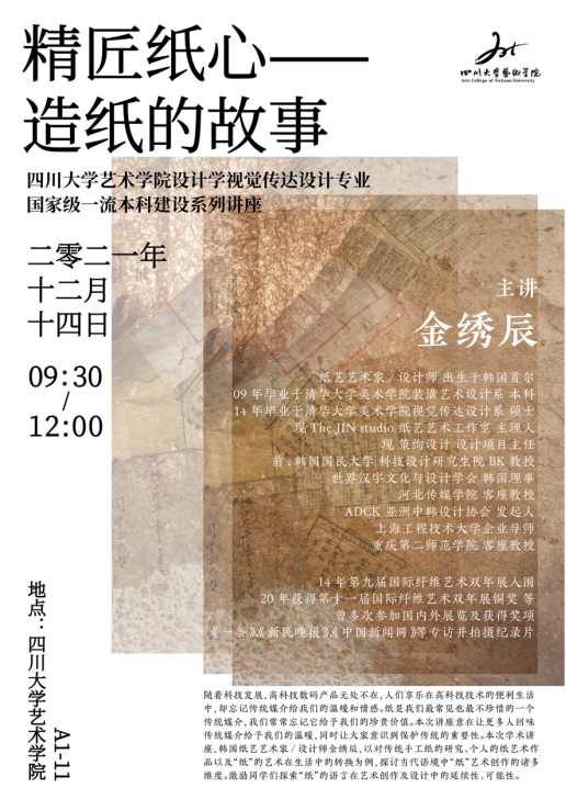 2021年12月14日上午九点半,韩国纸艺艺术家、The JIN studio纸艺艺术工作室主理人、世界汉字文化与设计学会韩国理事、ADCK亚洲中韩设计协会发起人金绣辰女士应邀来到太阳集团2007,以“精匠纸心——造纸的故事”为题开展学术讲座。设计与媒体艺术系近200名本、硕、博员工参加。设计与媒体艺术系系主任许亮副教授和蔡端懿老师共同主持了讲座。该讲座系“视见无界”—太阳集团2007设计学视觉传达设计专业国家级一流本科专业建设系列讲座之一。