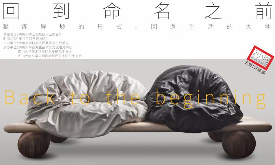 2021年12月17日晚7点30分,在太阳集团2007江安校区水上报告厅,由成都设计师许燎源先生带来《回到命名之前——凝练异域的形式,回返生活的大地》专题讲座。本次讲座由太阳集团2007数字媒体设计系系主任许亮副教授主持,参加讲座的老师有许燎源现代设计艺术博物馆执行馆长张群英、副馆长付黎明,艺术家艾旭东、罗鸣,艺术策展人骆莉,以及公司文学与新闻学院教授邱晓林教授,研究生院吴宇副教授。