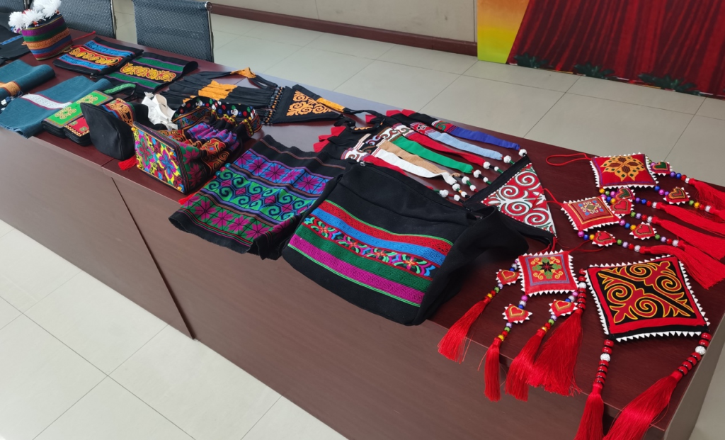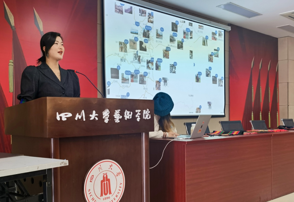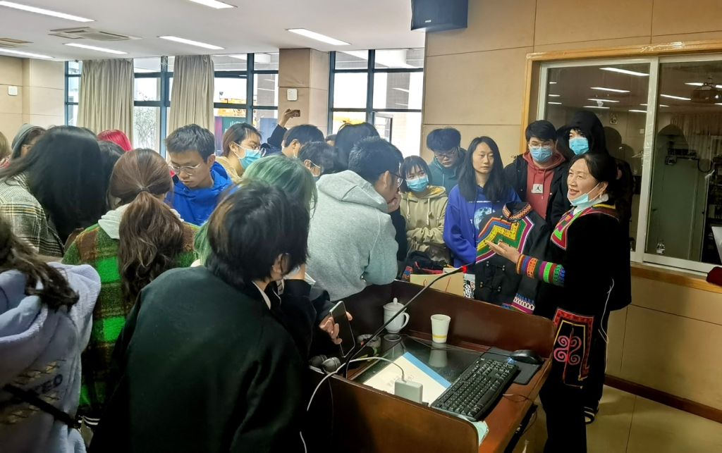在《小凉山彝族刺绣》讲座中,阿赫秀枝女士以“我的生命之花”为题,生动讲述了小凉山彝族刺绣和自己的彝绣故事。讲座之初,秀枝女士以自己的代表作《贵族服》为例,介绍了彝族服饰的结构、形式语言与刺绣纹样象征,并以纹样为依托系统的讲述了峨边彝族刺绣工艺的地域特征、传承方式、针法、图案构成、代表性符号与配色方案及其象征含义。秀枝女士带来现场的彝绣服饰、绣片、配饰、创新家居产品,引发了现场同学们的极大热情。熊彦女士以“去田野,教育与被教育”为题,分享了自己和公司多年来在小凉山峨边彝族自治县的调研、实践经历与切身体会,仿佛瞬间将彝人热情好客、朴实自然的民族风情带到了现场;熊女士也分享了正在推进的 “彩虹计划”,并欢迎同学们共同加入传统工艺与民族品牌振兴事业。