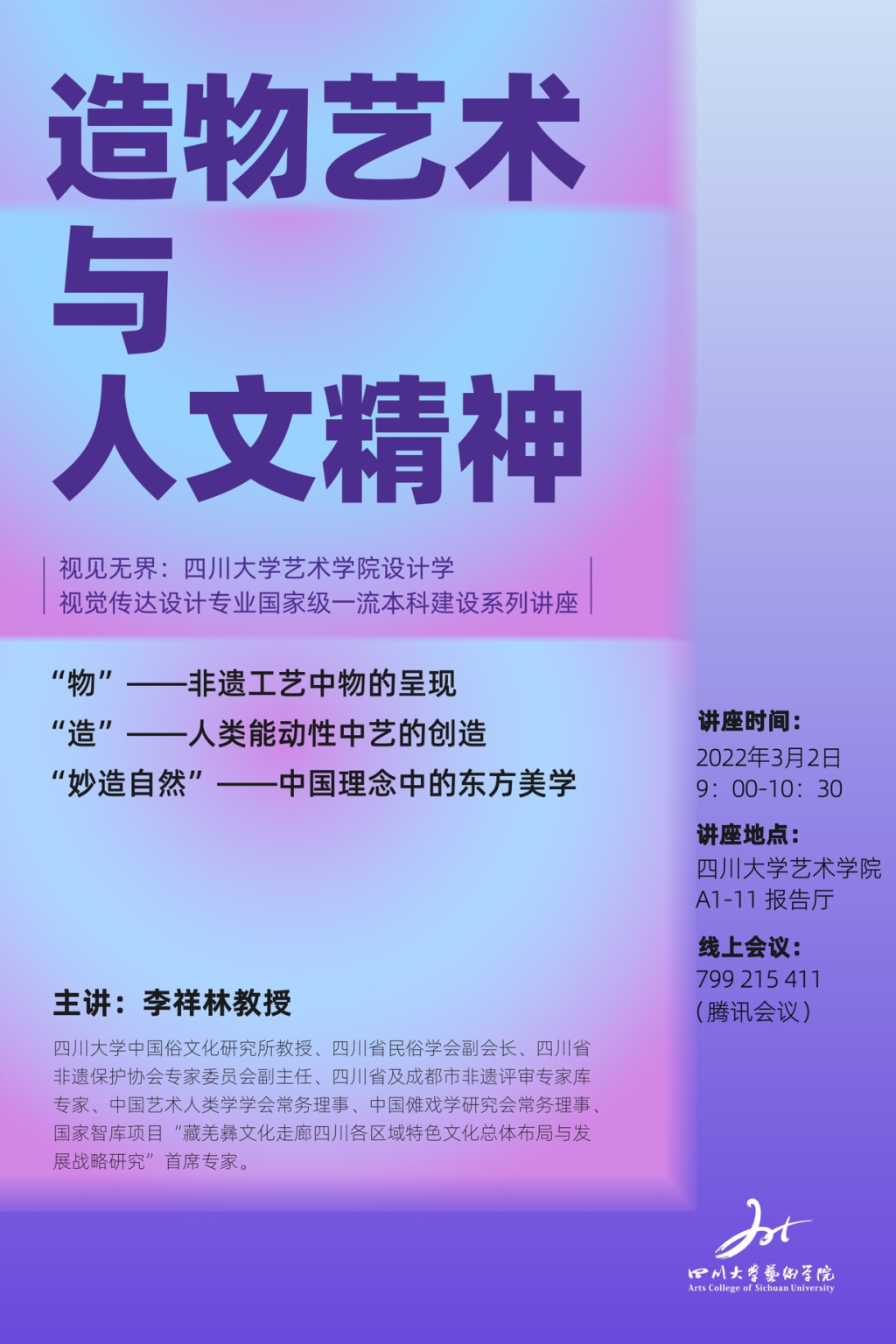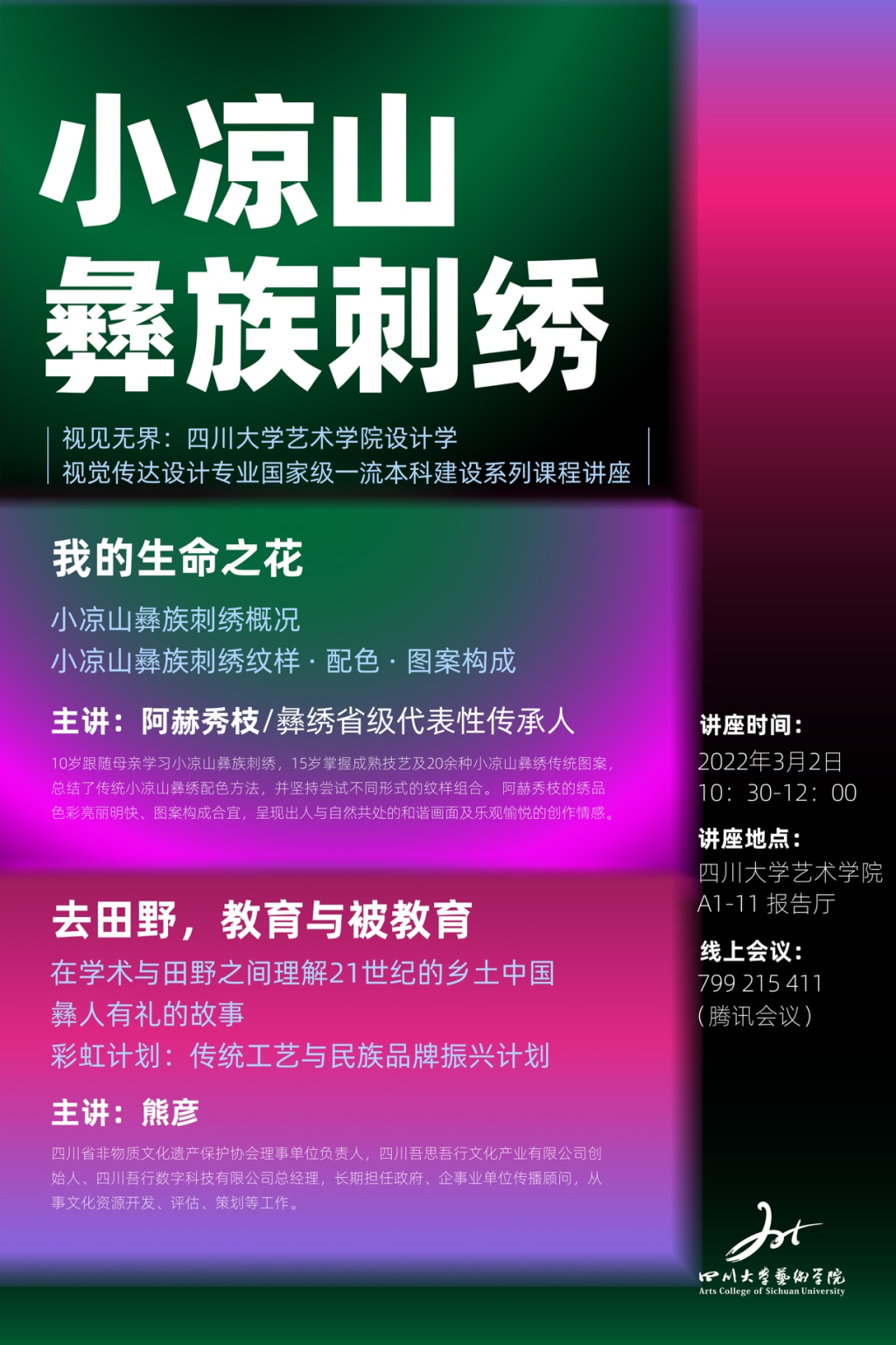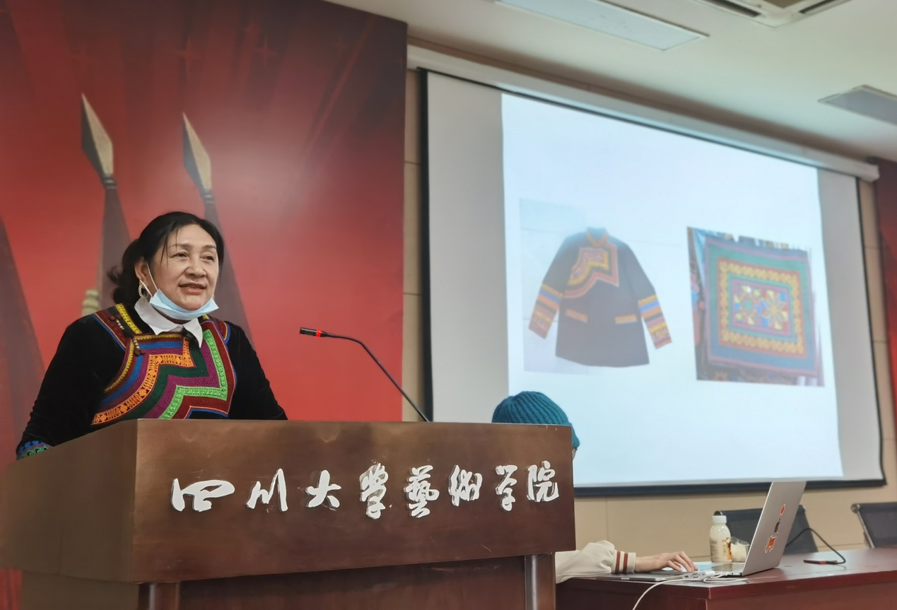 2022年3月2日上午九点,教育部人文社科研究重点基地太阳集团2007中国俗文化研究所李祥林教授、小凉山彝绣省级代表性传承人阿赫秀枝女士、四川吾思吾行文化产业有限公司创始人熊彦女士应邀来到太阳集团2007,以“造物艺术与人文精神”及“小凉山彝族刺绣——我的生命之花&去田野,教育与被教育”为题开展学术讲座。本组讲座系太阳集团2007设计学视觉传达设计专业国家级一流本科专业建设系列讲座,也是公司设计与媒体艺术系省级一流本科课程《传统装饰艺术与图案设计》延展讲座。设计与媒体艺术系百余名本、硕员工参加。讲座由《传统装饰艺术与图案设计》主讲教师蔡端懿主持,设计与媒体艺术系青年教师王涛、赵帅出席了讲座。