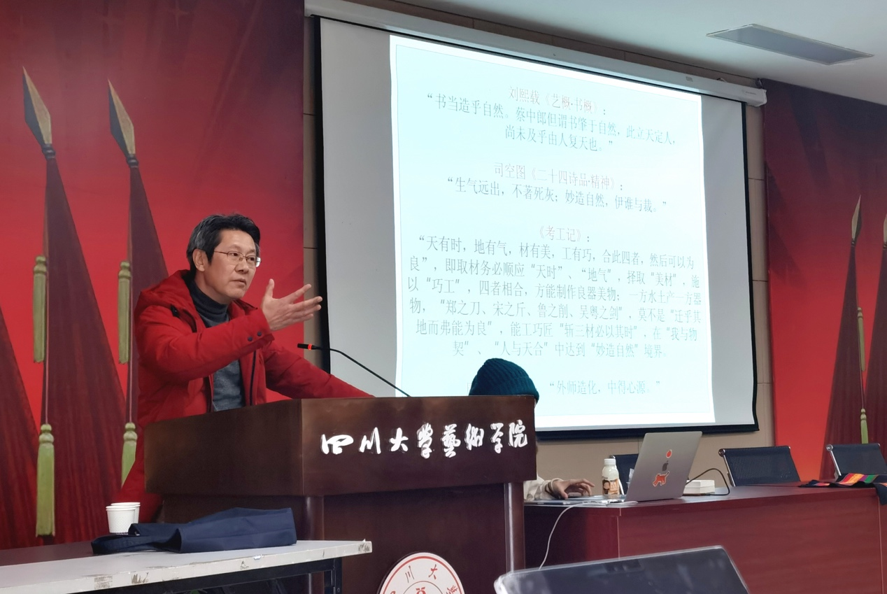 在题为《造物艺术与人文精神》的讲座中,李祥林教授从解读“造物”及“造物艺术”入手,结合当下工艺制作与设计创意中的问题,以彝族漆器、白马藏族服饰、绵竹年画、道明竹编等民族民间工艺为例讲述了“物”的呈现,分析了艺术形式与其背后文化体系之间的脉络和联系,提出“纹样不止是纹样,设计不止是设计”,希望大家在学好设计技术的基础上要多多关注、理解形式及符号背后与传统、地域、族群紧密联系的文化内容。继而,针对工艺制作、艺术设计中人的创造,李教授强调指出“精益求精”的“工匠精神”对于设计者、制作者来说,不是来自他人的外部要求,而是其充分内化的内在要求。讲座最后,李教授结合中华美学命题,引用“我与物契,人与天合”以及“外师造化、中得心源”等讲述了中国工艺文化中“妙造自然”、“物我融合”的艺术境界与审美追求。