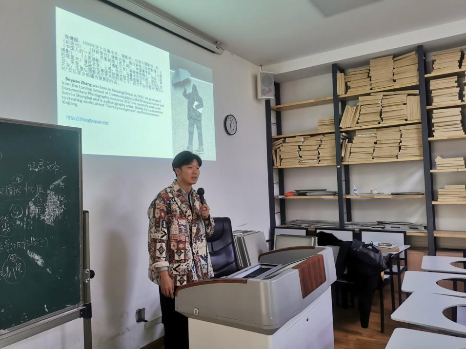 张博原向同学们分享自己毕业后的发展规划。展示了自己拍摄的一些人物肖像作品并对两位著名摄影师的作品进行了分析。同时,他结合自己对家乡探索的摄影书籍——《我的塔里木》向同学们分享了自己的家乡。针对书中的照片,他与同学们分享照片背后的故事,通过对新疆的实地考察与拍摄经历向同学们介绍了他的摄影经验与特点,分享了楼兰故城、司马义老人等有趣的故事。最后,张博原围绕自己的拍摄,引出了“影像与影像的对照”、“早期于阗画派”、“克孜尔千佛洞”、“达玛沟佛教遗址壁画”等主题内容。在自由提问环节,同学们针对摄影的决定性瞬间、典型性瞬间和个人摄影开始的过程、照片的后期是否会破坏其真实性等问题向张博原进行了提问。至此,讲座圆满结束。