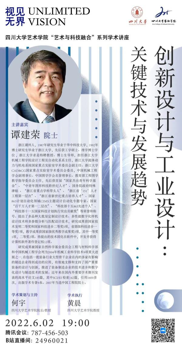 6月2日晚19:00,学院“视见无界——艺术与科技融合”系列学术讲座邀请中国工程院院士、浙江大学机械工程学院设计工程及自动化系系主任、浙江大学求是特聘教授、博士生导师谭建荣院士带来了以《创新设计与工业设计:关键技术与发展趋势》为题的线上讲座。学院经理何宇教授主持了此次讲座。