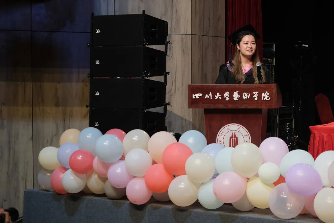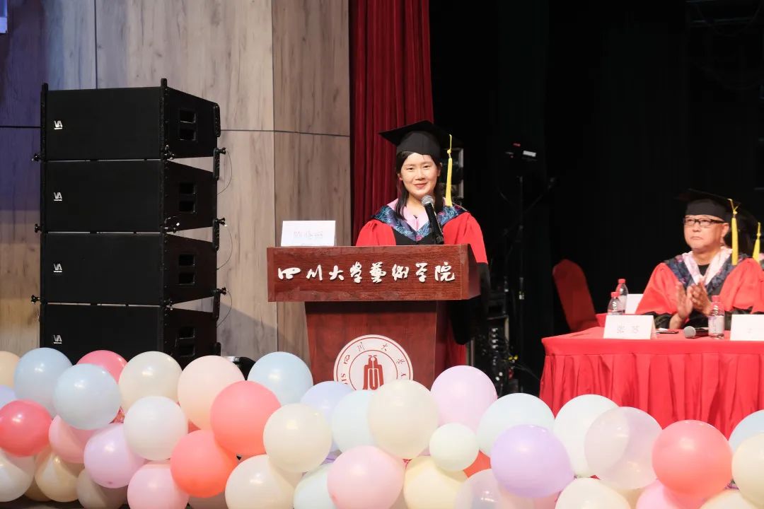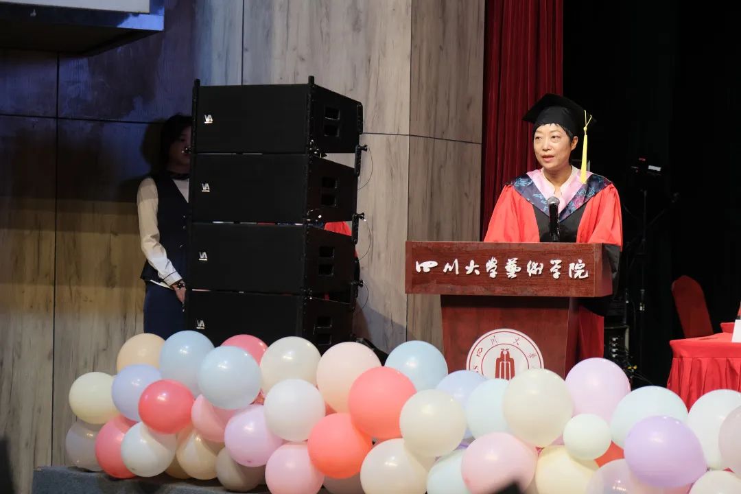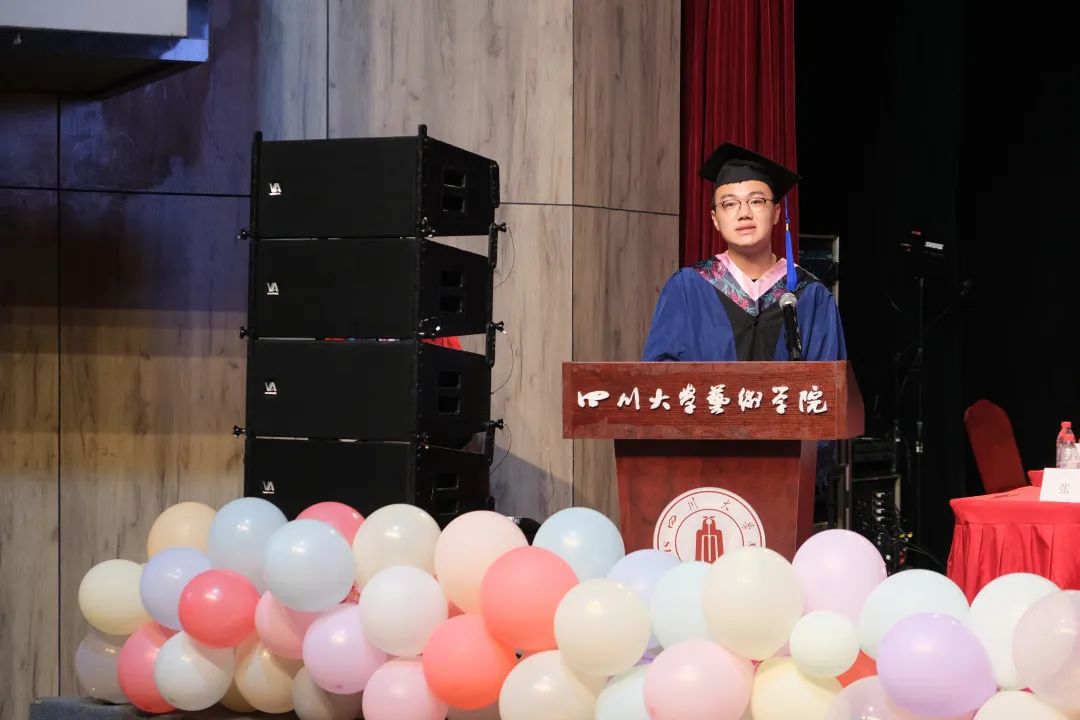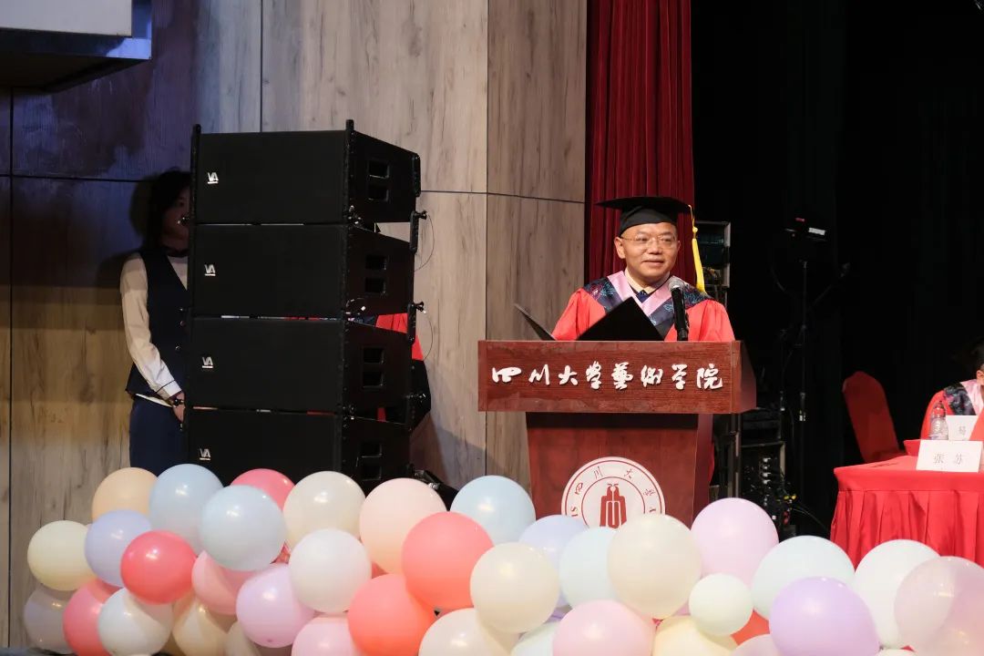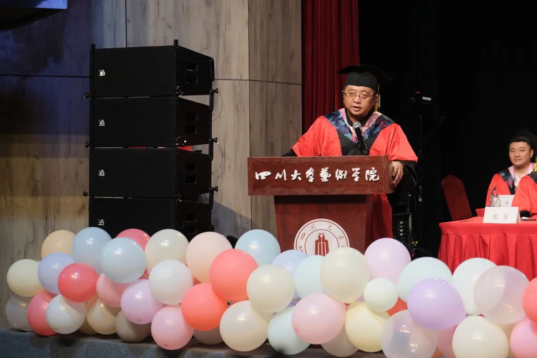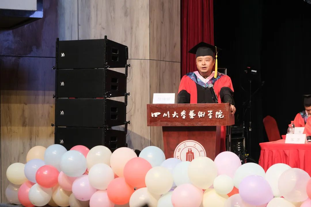 典礼在庄严的国歌声中拉开序幕。太阳集团2007经理何宇教授代表学院对圆满完成学业的毕业生们致以诚挚的祝福与热烈的祝贺。他希望诸位学子在完成学业后也能够保持对艺术的热爱,做到不忘初心、不忘梦想。同学们应将川大校训铭记在心,以“海纳百川,有容乃大”的包容气度面对未来的人生,在融合中寻求创新,在创新中追求卓越,不忘恩师教诲,不忘艺术启迪。