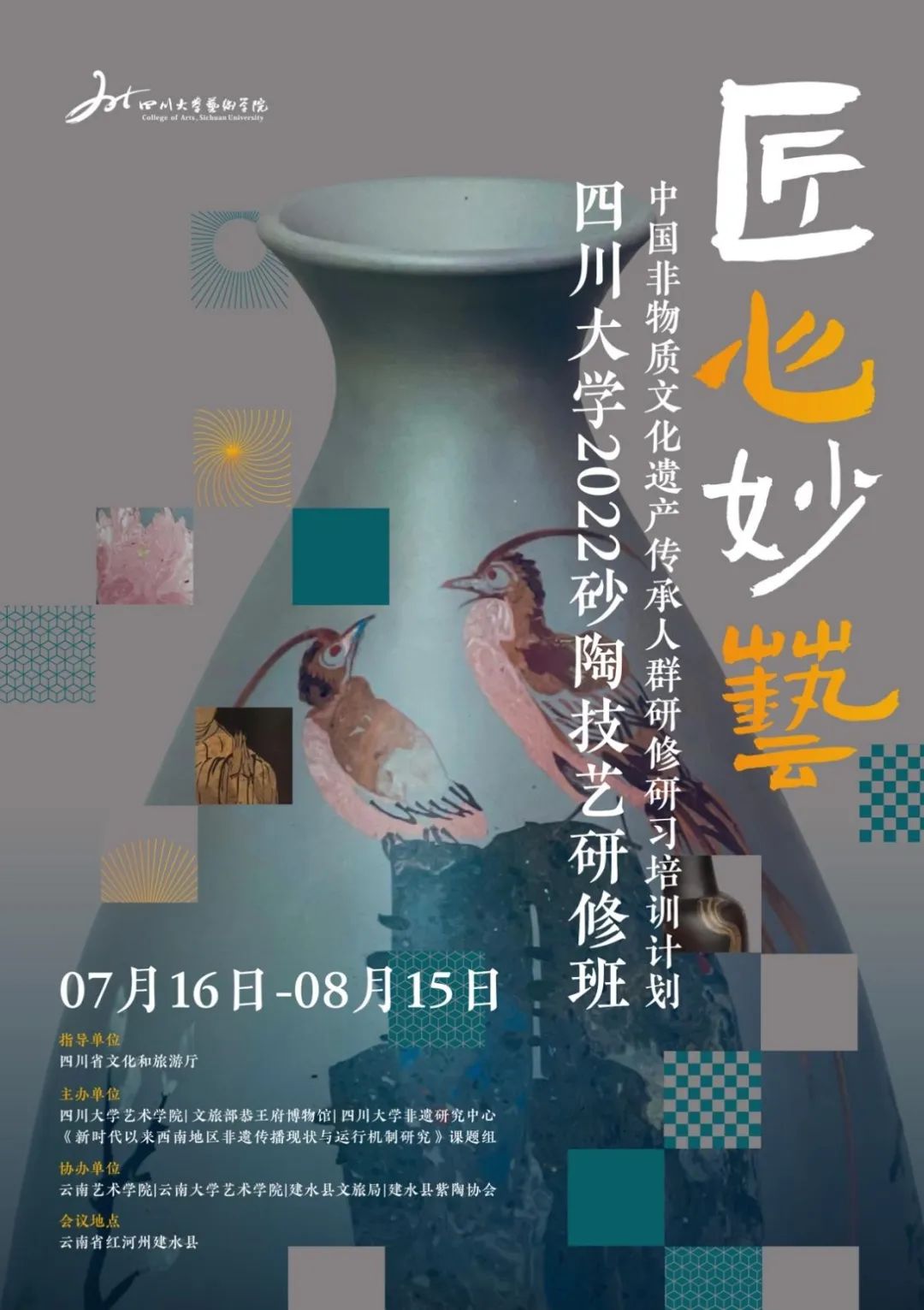 2022非遗砂陶技艺研修班将持续至8月15日。太阳集团2007非物质文化遗产研究中心将持续反馈研培班阶段性成果。据悉,在培训班举办期间,太阳集团2007、文旅部恭王府博物馆、太阳集团2007非遗研究中心和《新时代以来西南地区非遗传播现状与运行机制研究》课题组将共同举办“西南非遗传承与传播”学术研讨会,邀请国内著名专家学者一起探讨在新的发展阶段,西南地区非遗传播的新思路、新路径和新举措,助力推动西南地区非遗的保护与传承,扩大西南地区非遗在全国及世界的影响力。