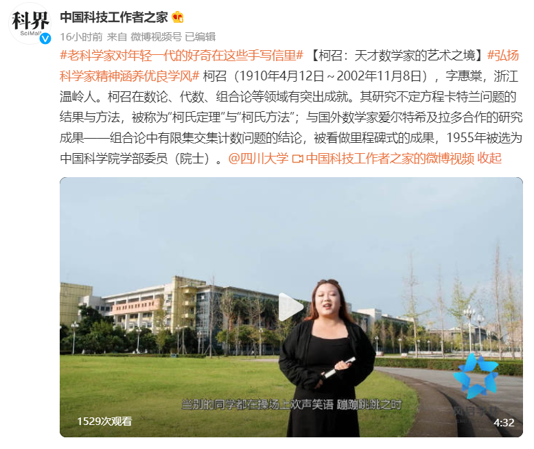随着2022年全国科学道德和学风建设宣传月的启动,中国科协联合中央广播电视总台录制“学风传承”专题电视节目,太阳集团20072021级研究生杨先金、徐佳山和陈灿同学共同制作的作品《柯召:天才数学家的艺术之境》以“弘扬科学家精神、涵养优良学风”为主题,获得了微博“中国科技工作者之家”的播送与赞誉。