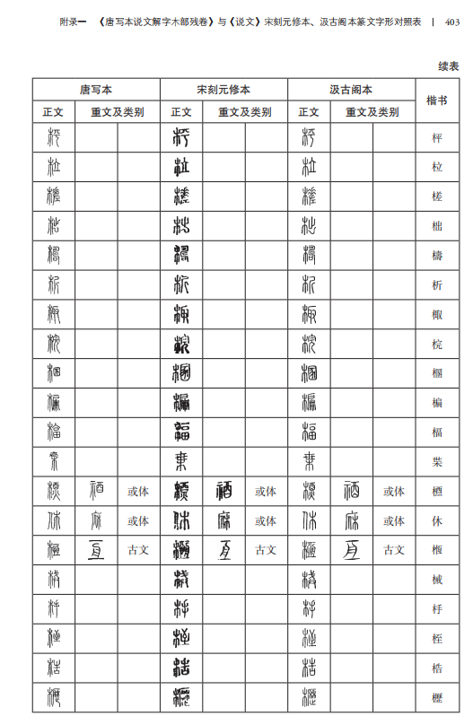 附录一 《唐写本说文解字木部残卷》与《说文》宋刻元修本、汲古阁本篆文字形对照表(395)