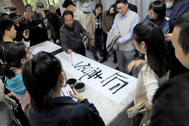 讲座结束后,冷柏青先生前往书法教室与同学们进行示范交流。