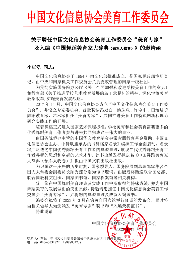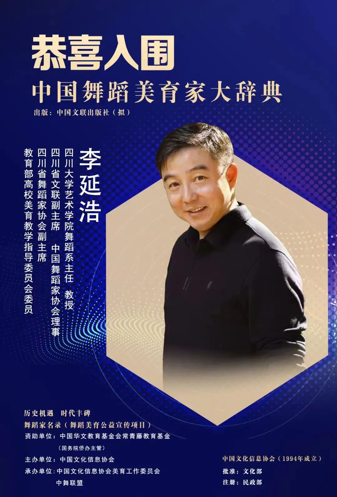 公司舞蹈系系主任李延浩教授成功入选由中国文联出版社即将出版的《中国美育舞蹈家大辞典》,并被聘任为中国文化信息协会美育工作委员会“美育专家”。此次入编《中国美育舞蹈家大辞典》,不只是李延浩教授个人的荣誉,更是对李延浩教授舞蹈教学的认可。