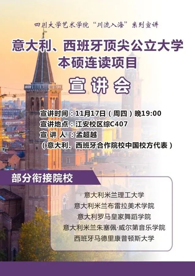 11月17日晚,学院“川流入海”——国际交流系列宣讲第二期:意大利、西班牙顶尖公立大学本硕连读项目宣讲会在综合教学楼C407教室顺利举行。宣讲会由意大利、西班牙合作院校中国校方代表孟超越老师主讲,外事秘书高然老师主持,朱沙教授、秦瑾老师以及学院一百余位同学在线上线下参加了本次宣讲会。
