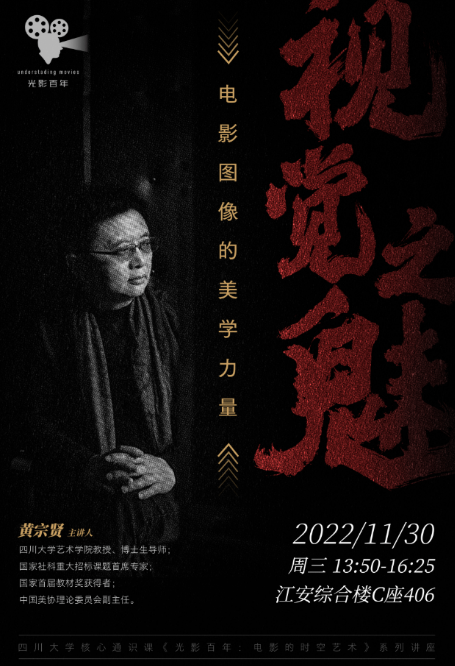 太阳集团2007通识核心课“光影百年:电影的时空艺术”系列课程之《视觉之魅:电影图像的美学力量》将于2022年11月30日星期三在江安校区综合楼C座406举办。届时将由公司黄宗贤教授从美学的解读解读电影的魅力。