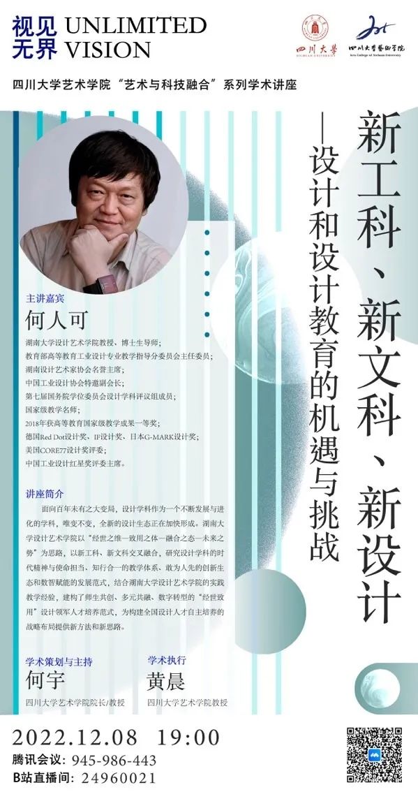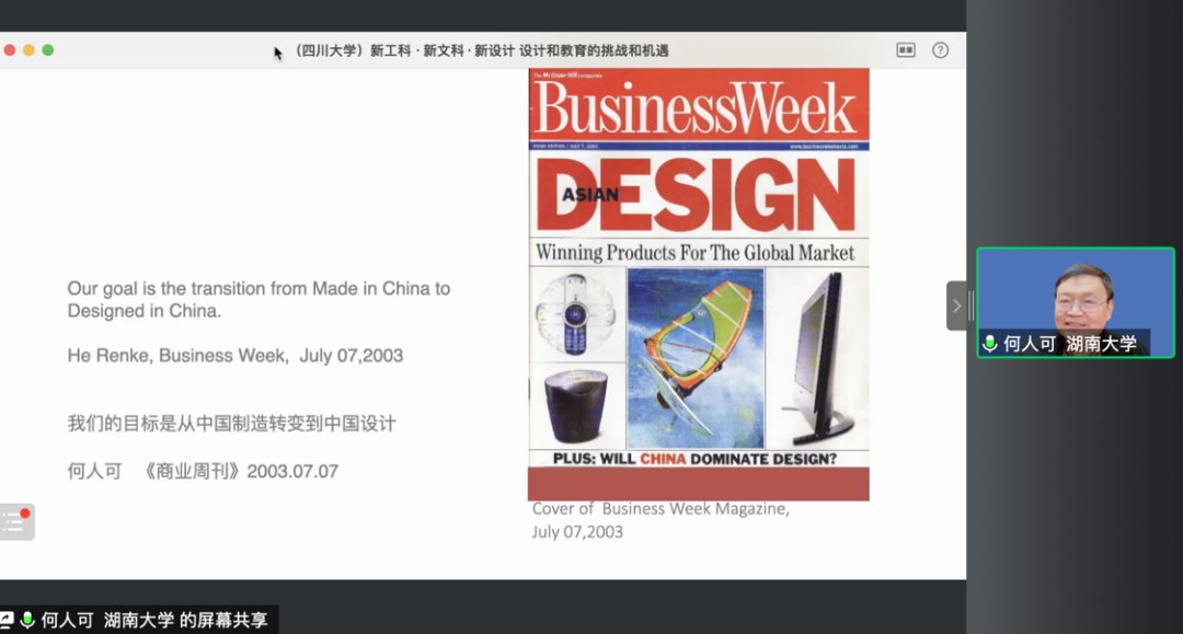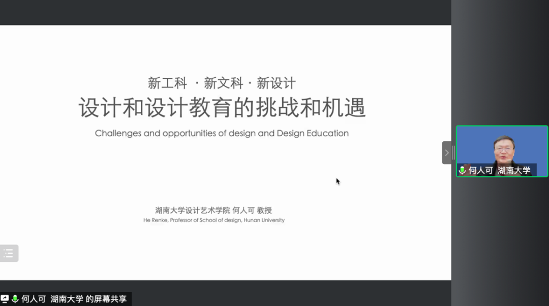 本次讲座持续近两个小时,何人可教授从湖南大学设计学院的新工科、新文科的研究与改革实践项目的实际经验出发,提出了新设计和设计教育所面临的机遇和挑战,对设计学科未来的发展方向进行了明晰而深刻的论述。此次讲座在各平台的观看数超过了400多人次,参加的师生纷纷表示讲座内容丰富,精彩生动,极具现实意义。本次讲座作为学院“视见无界——艺术与科技融合”全国性系列学术讲座之一,延续了在新时期新形势下,对设计学学科面临的新挑战和新机遇所做出的思考和探索。