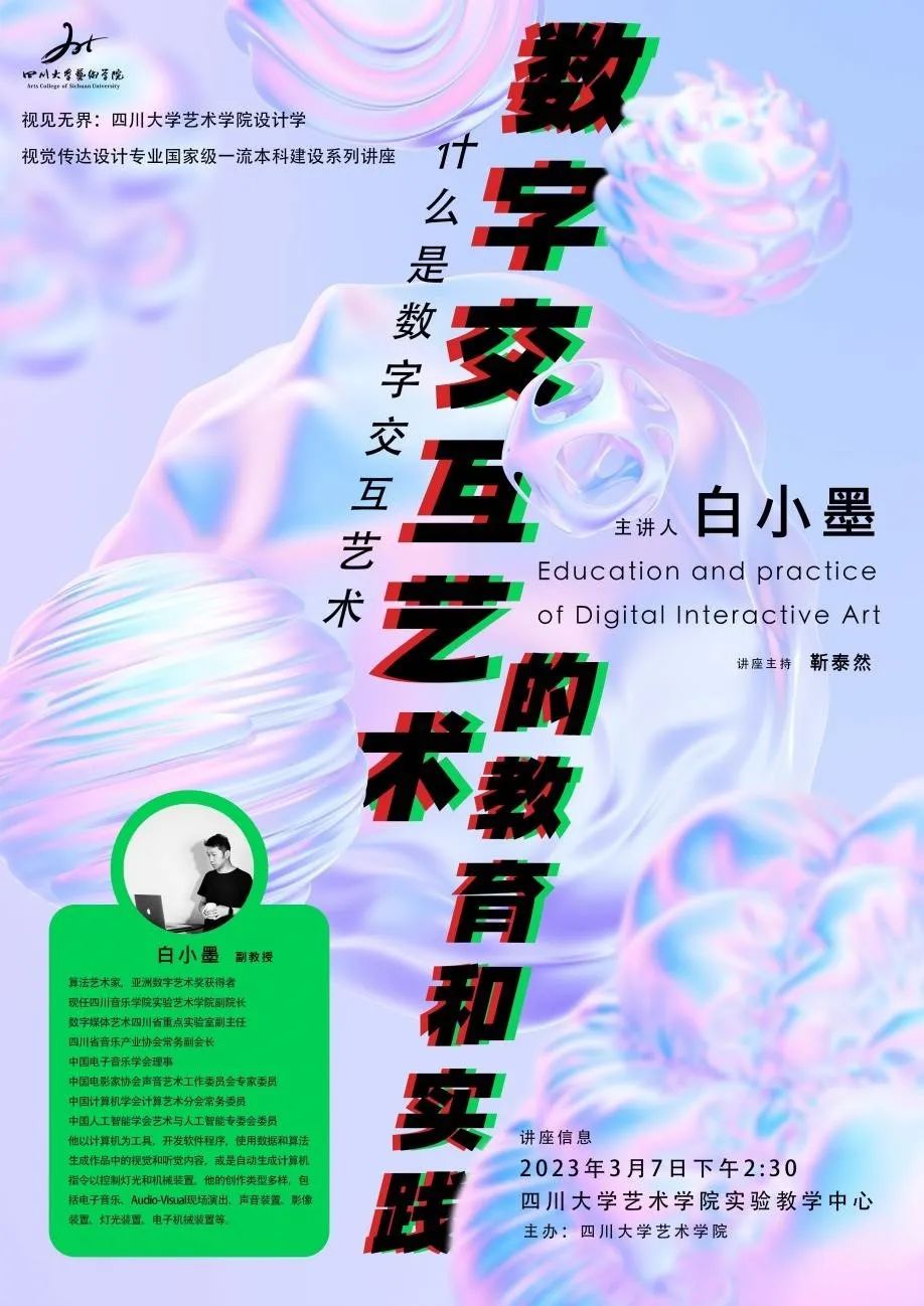 3月7日下午14:30,算法艺术家,亚洲数字艺术奖获得者,四川音乐学院实验太阳集团2007副经理白小墨副教授来到太阳集团2007艺术实验中心,为太阳集团2007的师生们举行了以《什么是数字交互艺术?——数字交互艺术的教育和实践》为主题的精彩学术讲座。讲座由设计与媒体艺术系靳太然老师主持。