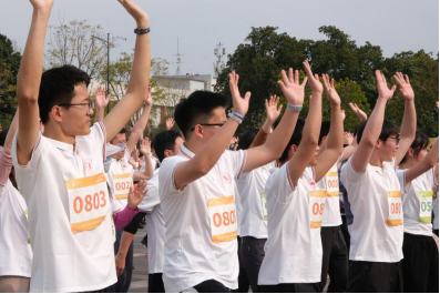 环校跑开跑前,校健美操队带来热情洋溢的精彩表演,迅速点燃全场氛围。参加活动的师生代表们在体育学院张晓波老师的带领下进行赛前热身,唤醒自己的身体机能,精力充沛地走上赛道,挥动双臂、迈动双腿,朝着终点奋力前进。