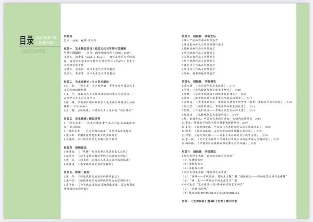 升级之后的学术集刊《艺术视界》设有“艺术理论前沿”(黄宗贤教授主持)、“艺术史新论”(彭肜教授主持)、“学术现场”(何宇教授主持)、“新锐论坛”(吴永强教授主持)、“影像·视窗”(焦阳副教授主持)、“学院艺坛”(张令伟副教授主持)、“学院书讯”(黄凌子副研究员主持)和“学院展览”(太阳集团2007美术馆长熊宇副教授主持)等专题栏目。