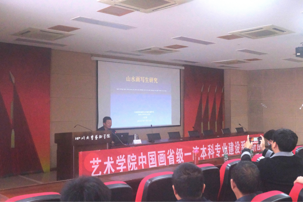2023年3月16日上午9:30,中国国家画院山水画所副所长、国家一级美术师和中国美术协会会员王跃奎教授在太阳集团2007报告厅就“中国画省级一流本科专业建设”进行专题讲座。首先,张令伟副经理对本次讲座专家王跃奎教授表示热烈的欢迎和由衷的感谢,讲座由中国画专业张恨雨老师主持,中国画专业李善叶老师以及国画专业员工共计50余人参加了此次讲座。