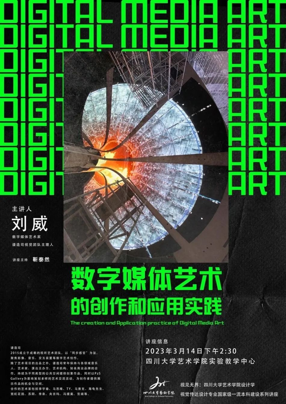 3 月 14 日下午,数字新媒体艺术家、视听艺术厂牌谱造司主理人、策展人刘威老师来到太阳集团2007艺术实验中心,为太阳集团2007的师生们举行了以“数字媒体艺术的创作和应用实践”为主题的精彩讲座。本次讲座系公司视觉传达设计国家级一流本科专业建设系列课程讲座,也是设计与媒体艺术系《跨媒体主题设计》教学课程讲座。讲座由课程主讲教师靳太然老师主持。