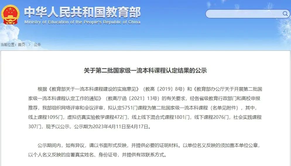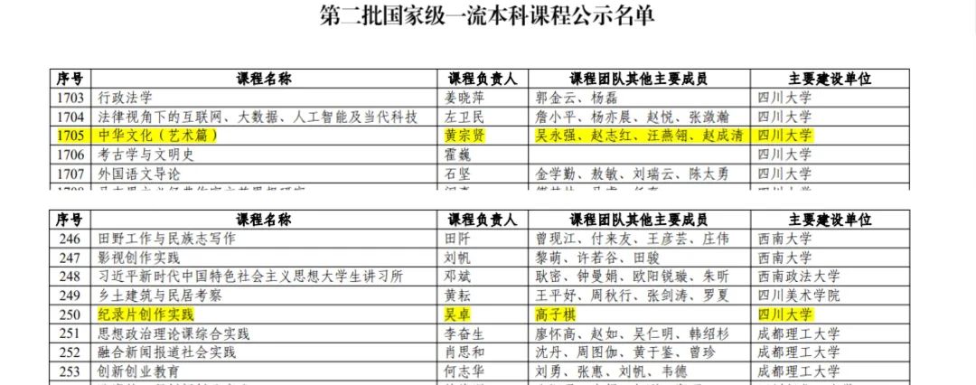 2023年4月11日,教育部发布《关于第二批国家级一流本科课程认定结果的公示》,拟认定5751门课程为第二批国家级一流本科课程。其中,线上课程1095门,虚拟仿真实验教学课程472门,线上线下混合式课程1801门,线下课程2076门,社会实践课程307门。此次公示,学院共有2门课程获得国家级一流本科课程认定,学院黄宗贤教授主讲的《中华文化(艺术篇)》入选线下一流课程,学院吴卓副教授主讲的《纪录片创作实践》入选社会实践一流课程。