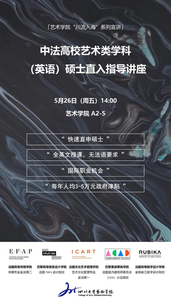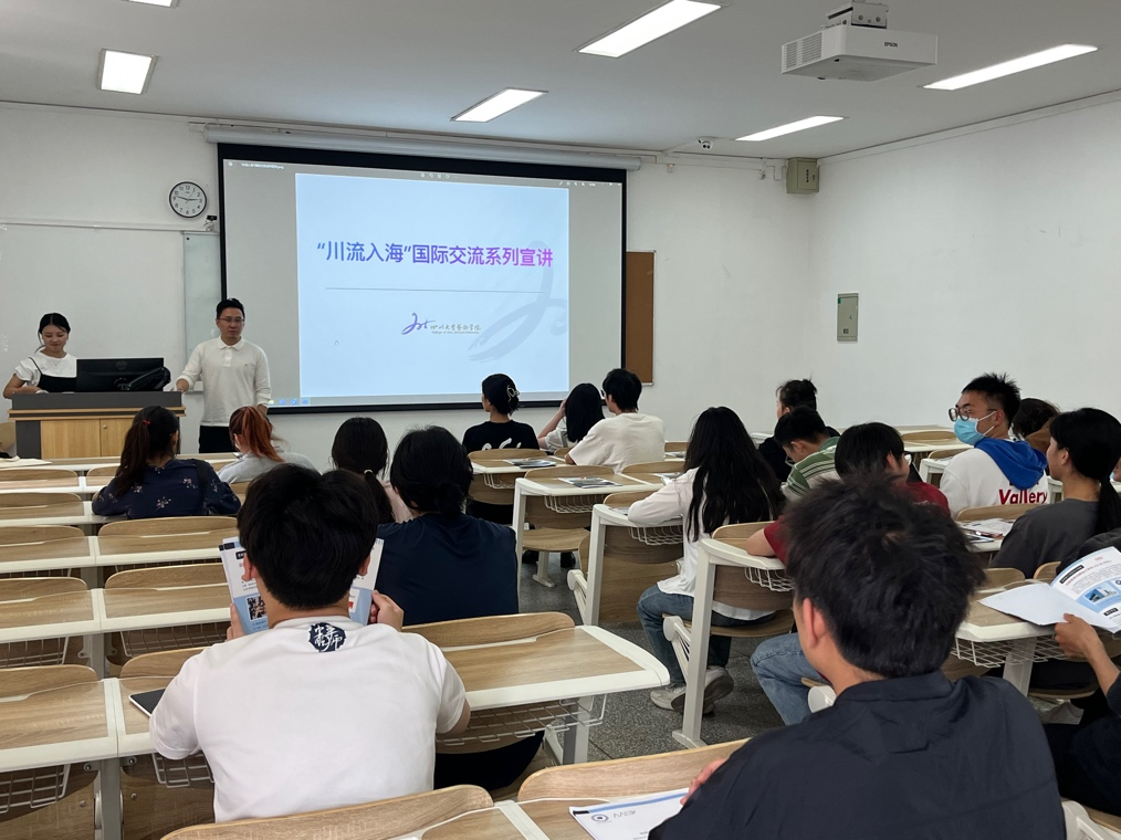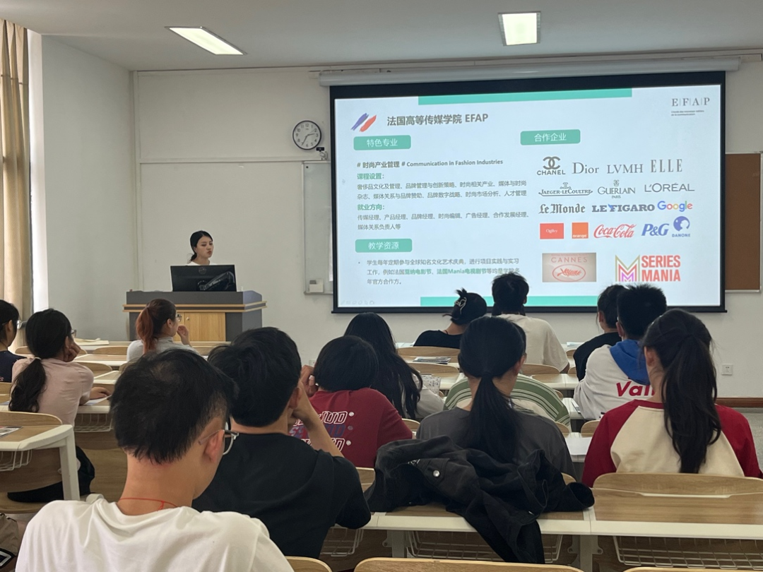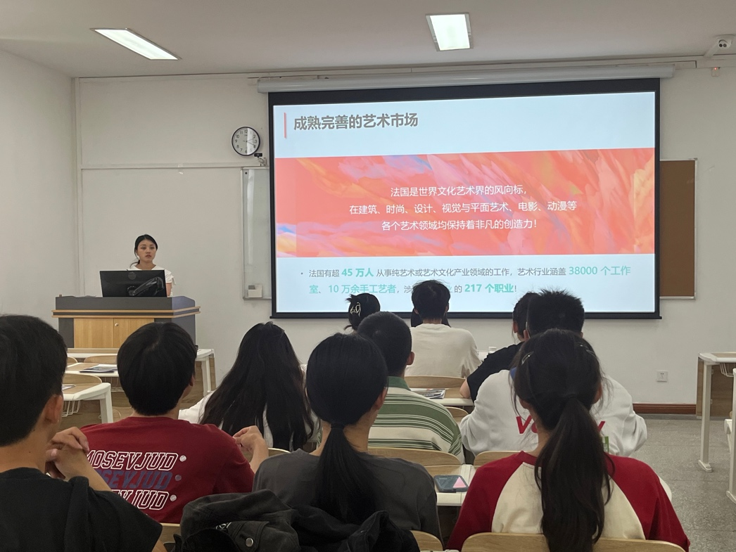 5月26日下午,学院“川流入海”——国际交流系列宣讲第四期:法国高校艺术类学科(英语)硕士直入指导宣讲会在学院A2-5顺利举行。宣讲会由法国校方代表、中欧文化教育协会张斯琴老师主讲,外事秘书高然老师主持,数十名相关专业的同学参加了本次宣讲会。