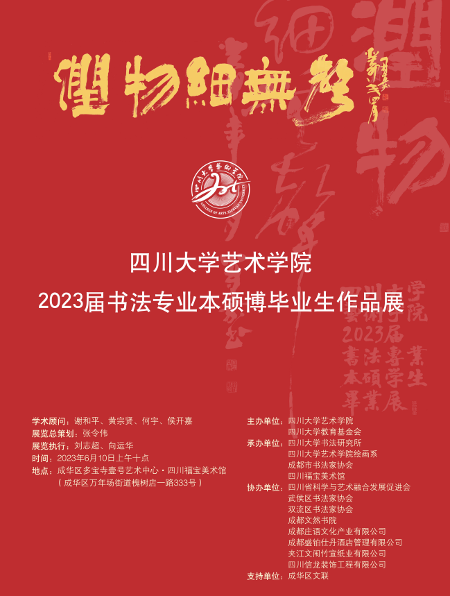在三年疫情完全结束,又正值深入开展学习贯彻习近平新时代中国特色社会主义思想主题教育的伟大时刻,又一届川大书法专业本、硕、博员工毕业了。川大书法专业的发展,与每一届学子所取得成绩息息相关。每年此刻,我都要为员工毕业作品集作序,虽片言只语,但充满着一位师者和对中国书法与传统文化有着深厚情怀的长者于同学们的深情。作为第六届书法专业本科名誉班主任,我又一次见证了川大书法专业发展历程中的一件大事,又见证着一批书法学子成才并走向社会,我由衷欣慰。“送君千里,终有一别”,此刻,我对本届毕业同学临别寄语如下,包含着我做人做事态度,对客观世界认知,与同学们共勉。