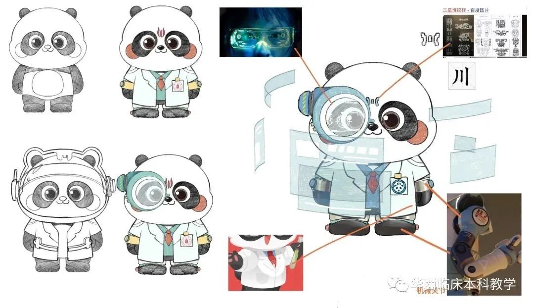 以熊猫敦厚可爱的形象传递仁爱之心,在此基础上对它进行科技化创新以展现川大与时俱进守正创新的精神,促进人们能更好的发现医学之美。以可爱的熊猫形象作为医工融合的IP形象,设计了18个生动的表情包来供医学工作者使用。这些表情包以国宝熊猫为载体,将川大华西医学与川大工科两者的核心元素融入在IP形象中。