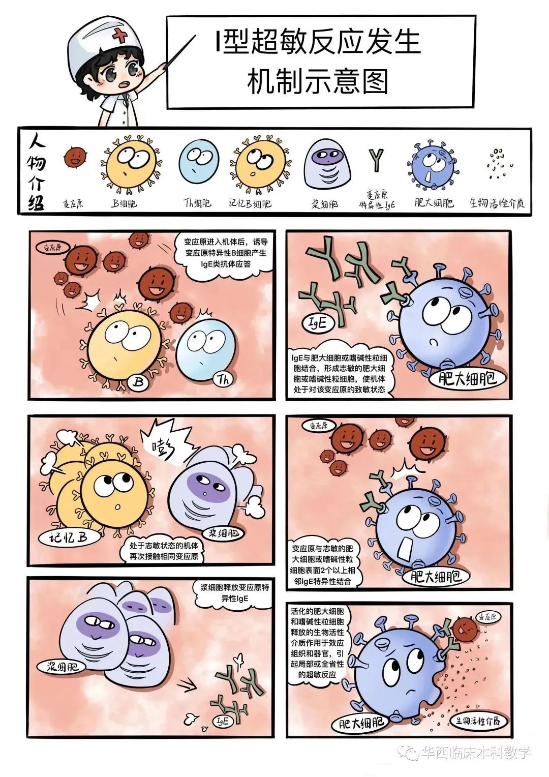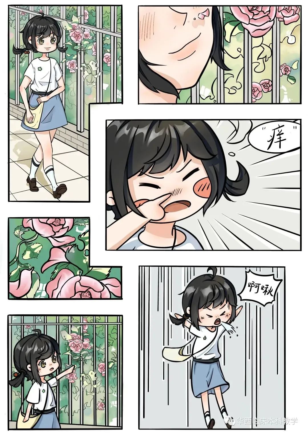 我们的作品以Ⅰ型超敏反应为基础,用一个小女孩在日常生活中对花粉过敏的现象引入Ⅰ型超敏反应的反应机制,接着我们介绍了Ⅰ型超敏反应的防治方法。我们运用漫画的形式生动形象地表现了超敏反应,也使该反应的机制和防治更加通俗易懂。
