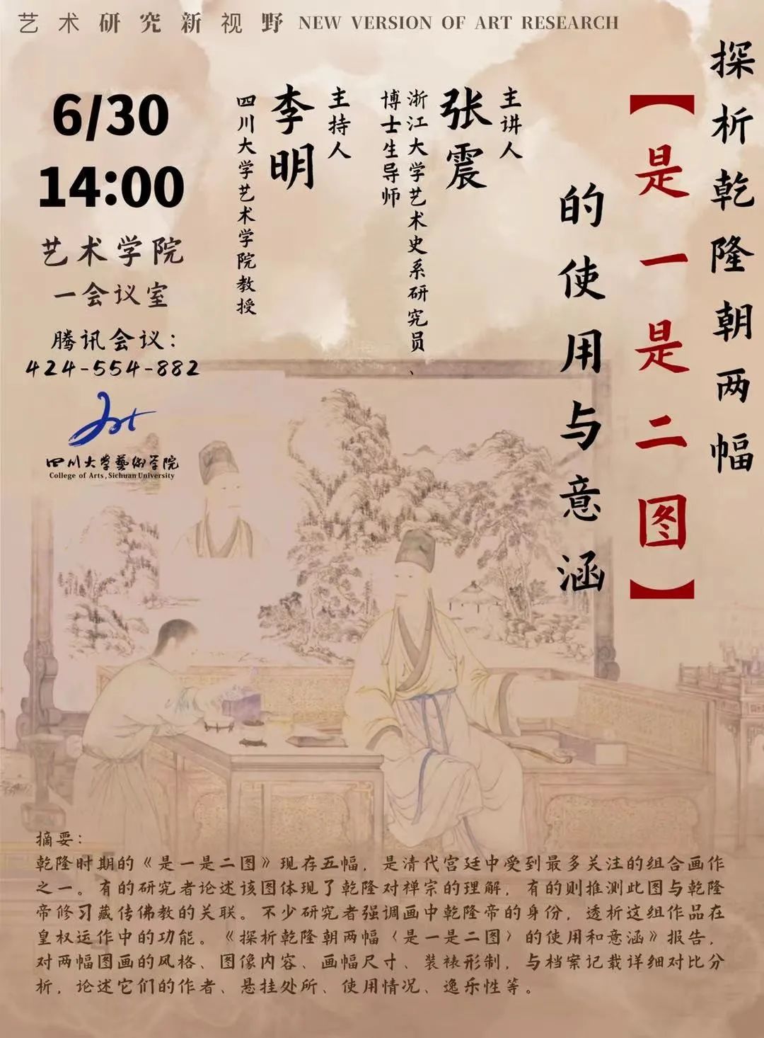 乾隆时期的《是一是二图》现存五幅,是清代宫廷中受到最多关注的组合画作之一。有的研究者论述该图体现了乾隆对禅宗的理解,有的则推测此图与乾隆帝修习藏传佛教的关联。不少研究者强调画中乾隆帝的身份,透析这组作品在皇权运作中的功能。《探析乾隆朝两幅<是一是二图>的使用和意涵》报告,对两幅图画的风格、图像内容、画幅尺寸、装裱形制,与档案记载详细对比分析,论述它们的作者、悬挂处所、使用情况、逸乐性等。在此基础之上,运用乾隆帝诗文集等文献和相关的器物、绘画等,尝试把画上的每一句题语放入到乾隆帝诗文集的语言原境,和绘画原来观看的场景中,对比乾隆内府中与此两幅画类似的观赏对象及其品题诗句,分析这两幅画上的题识,审视两幅画的功用、意涵,揭示乾隆帝的品赏观念及其与老庄思想的渊源。总之,论文试图建构作品当时的历史情境,从绘画制作过程和视觉观看的逻辑入手,探索两幅《是一是二图》乃至清代宫廷绘画新的解读方式,试图为思想史与艺术史结合找出一条新的研究路径。
