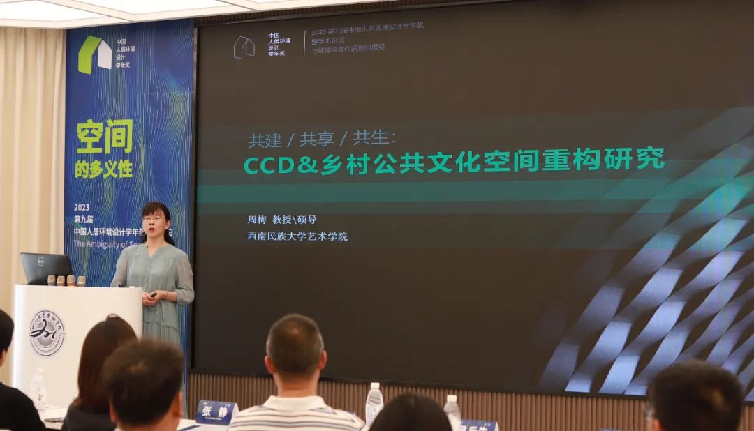 西南民族大学太阳集团2007设计系副主任、教授、硕士生导师周梅做了题为《共建、共享、共生:CCD方法下乡村公共文化空间重构研究》的分享。周梅教授从乡村振兴的视阈下出发,指出长期以来设计缺席乡村建设发展,而当下设计助力乡村振兴的作用日益显著,并提出设计思维下UCD到CCD模式的转化,以聚焦乡村振兴与助力乡村公共文化空间建设,探讨其复杂性与现存问题,从而提出开拓视野、准确定位、思维跨界的三个乡村空间重构角度。