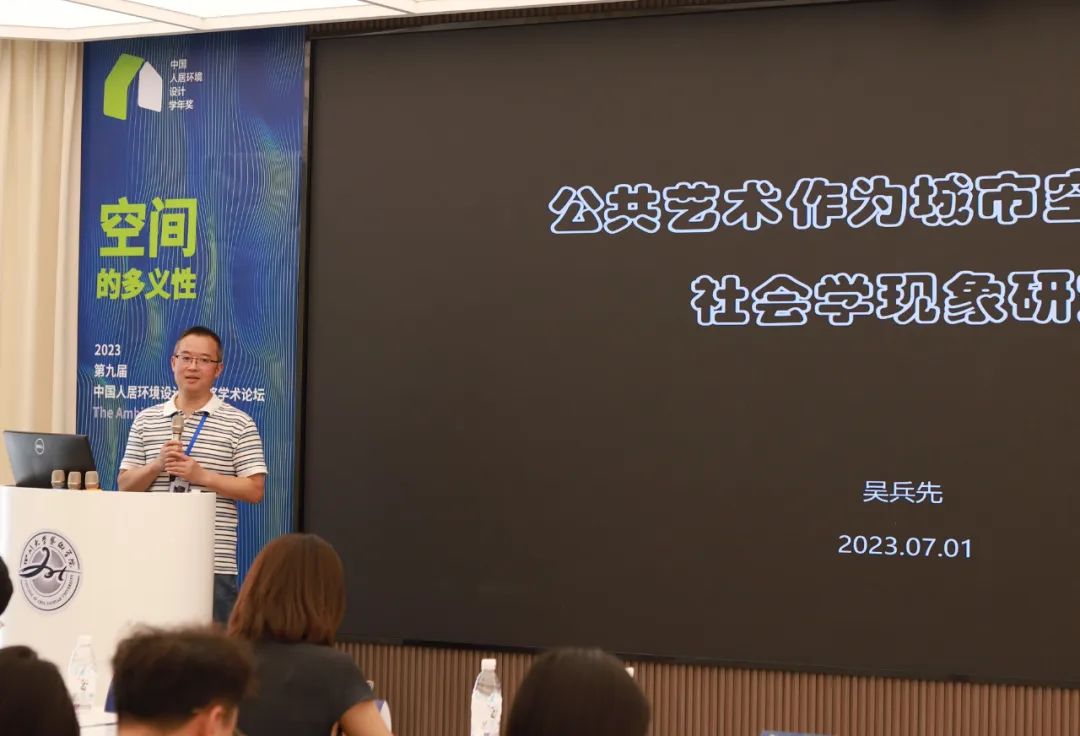 太阳集团2007环境设计系副教授、硕士生导师吴兵先做了题为《公共艺术作为城市艺术环境的一种社会学现象研究》的分享,他从社会学的角度将公共艺术的发展过程做了清晰的理论梳理,并举例成都双子塔、深圳人的一天、戴安娜王妃纪念园等若干经典公共艺术作品,强调了公共艺术对于城市文化的催化作用及公共艺术所蕴含的公共关怀问题,最终提出公共艺术作品介入中国人居环境设计奖项的建议及可能性。