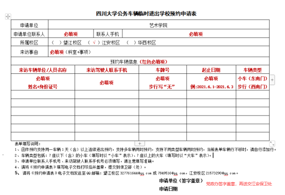 5.线上预约至少提前一天申请,党政办负责统筹报送保卫处;当天预约请直接填写《校外车辆、行人进校预约申请表》(官网或群文件下载),到党政办盖章后自行送交江安保卫处。