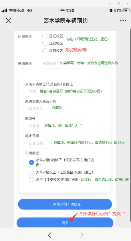 3.原则上车辆预约仅限校内教职工、在校工作人员及进校维修安装施工人员等,车辆预约不对员工开放(特殊情况请辅导员协助办理预约手续)。