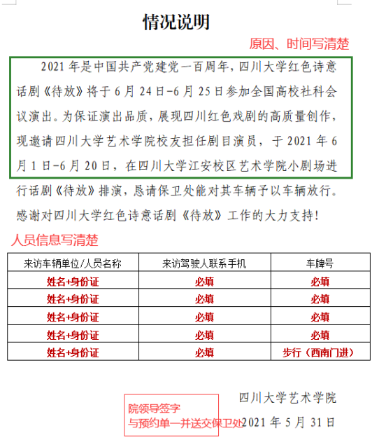 6.车辆、步行进校原则上不可超过3天,超过3天需写情况说明,院领导签字盖章后报送保卫处线下办理。
