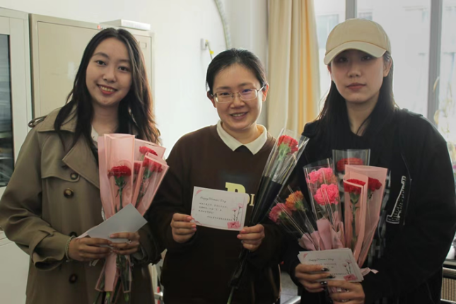 3月8日下午,员工们在学院广场集结。在员工骨干的带领下,大家结合教学安排,紧密利用下课时间,分批走进教室、办公室,为学院的全体女性教职工们献上了鲜艳的康乃馨。