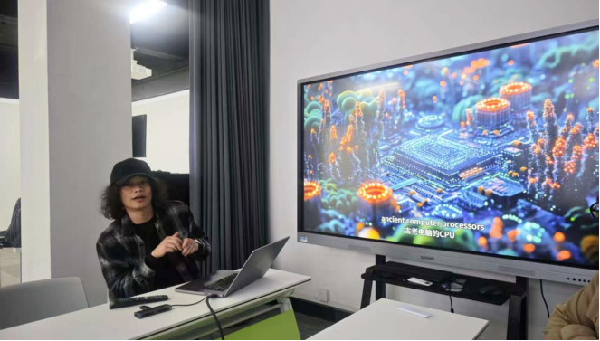 本次会议由设计与媒体艺术系系主任许亮副教授主持,设计与媒体艺术系全体教师、艺术公司党政办主任王涛老师参加。靳太然老师以“数智时代AI赋能一流本科发展”为主题分享了AI技术语言在设计教学中的融合与教学案例,分享其在实践交互艺术和AIGC的应用中设计教学方法、理念的改变。许亮、王蓓、李贞、赵帅老师指出,应适当鼓励技术语言在本科教学场景和实践中的应用,同时警惕“技术至上”的倾向,注重以“立德树人”为导向的教育目标,培养员工的原创意识和设计思维能力。