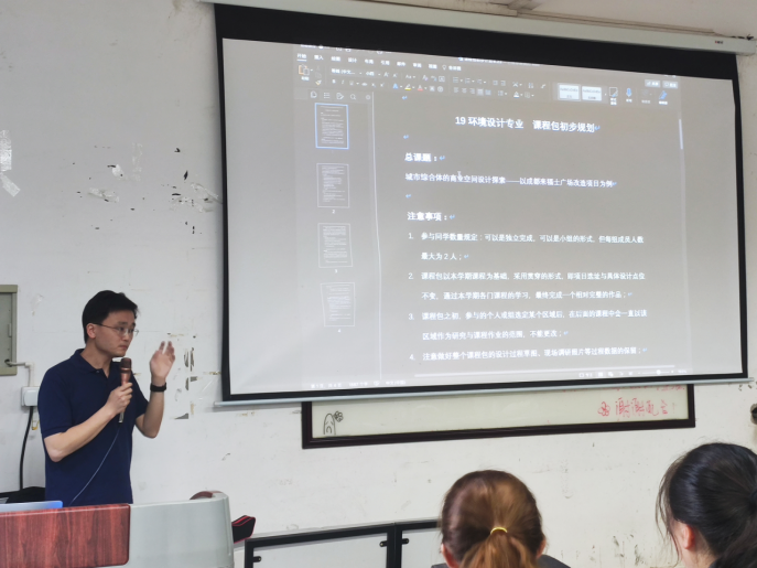 为进一步加强环境设计专业的团队建设,提升环境设计专业课程的教学效果,环境设计系于2021年初集体申报了“深化创新创业教育研究——环境设计专业课程包建设”的教改项目。其实,环境设计专业课程包不是新鲜事物,在之前的几个年级都有不同相邻课程的专业老师开展了小范围的尝试,也取得了一定的效果,但一直没有在一个年级、整个学期中完全执行。自2021年5月18日获批太阳集团2007新世纪高等公司产品改革工程(第九期)研究项目立项以来,全系专业教师齐心协力、献计献策、各司其责,抓住每次集体专业教学研讨会的机会展开专业课程包建设推进的讨论与计划修订。经过了近4个月的准备,如期在2020-2021秋季学期开学之际在19级环境设计推行专业课程包建设。8月31日开学之初,环境设计系的全体教师集体亮相,为19级环境设计专业同学讲述本学期专业课程包的总体安排,再由各位本学期参与专业课程包建设的专业教师分别提出具体的要求。