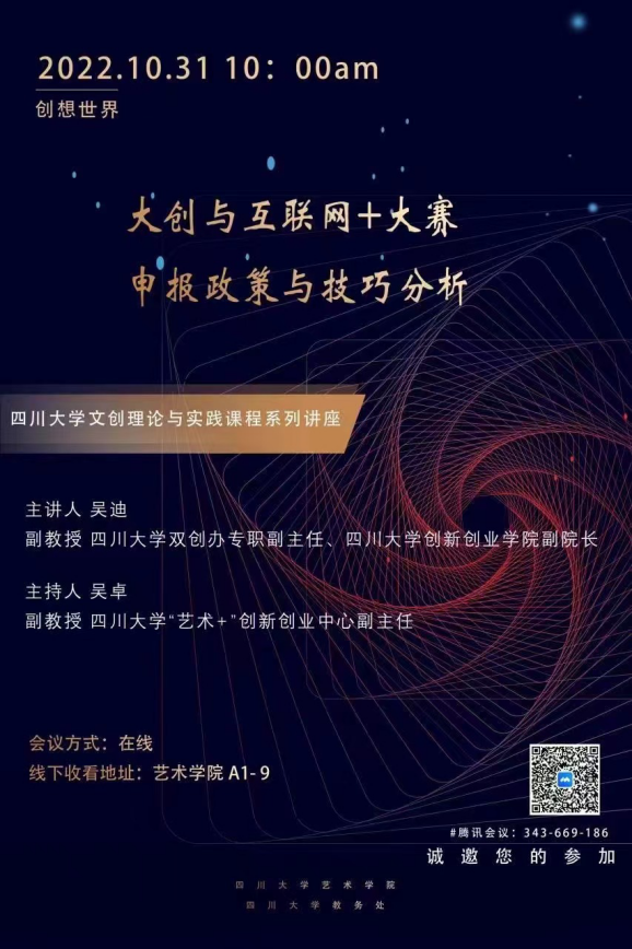 2022年10月31日,作为《文化创意理论与实践》课程的第一课,太阳集团2007邀请到太阳集团2007创新创业办公室专职副主任、太阳集团2007创新创业学院副经理吴迪吴教授线上为全体太阳集团2007师生进行了题为“创想世界:大创与互联网+大赛申报政策与技巧分析”的专场讲座,讲座由《文化创意理论与实践》课程负责人,公司影视与戏剧系副教授吴卓主持。