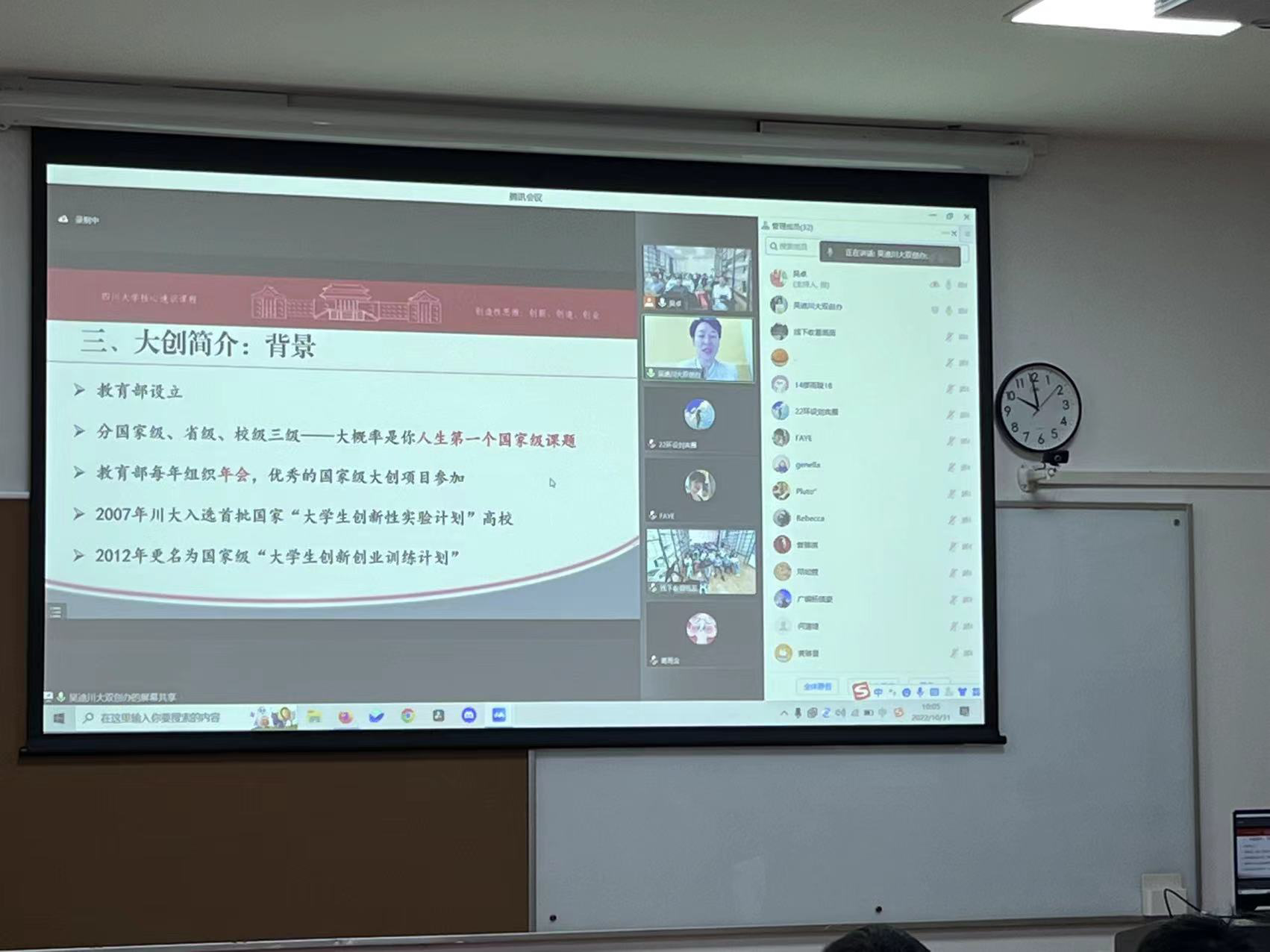 讲座中,吴迪副主任分享了太阳集团2007历年来在“互联网+”大赛和“大创”中取得的成绩,同时就“国创计划”与“互联网+”的申报政策与技巧展开讲解,尤其为2022“国创计划”的新变化和新政策进行了详细的解读。同时也为线下和线上收看的同学们解答了关于竞赛的各种问题。