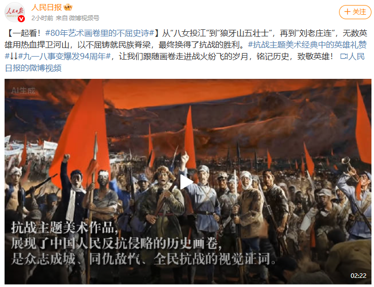 作为承载集体记忆的艺术创作,该视频以“永铭历史、警钟长鸣”为核心立意,选取“八女投江”、“狼牙山五壮士”、“巍巍太行山”等37个讲述经典英雄事迹的抗战美术作品为创作基底,通过动态化艺术表现形式并辅以AI技术,串联起抗战时期的不屈篇章。静态美术经典在数字技术赋能下“鲜活起来”,既生动再现了无数英雄用热血捍卫河山、以不屈铸就民族脊梁的壮阔历史,更以艺术感染力践行“抗战主题美术经典中的英雄礼赞”创作主旨,呼应“铭记历史、缅怀先烈”的时代命题。