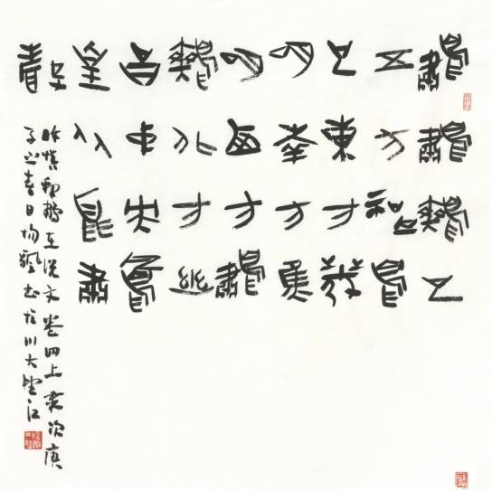 尤宜推扬者,其治学与治艺相辅相成,互促互补,成果日丰。其书法各体相通,兼融互证,功力之养成坚实而富内蕴。书与印相通,致其印艺通源流,明其理,纵横变化,发之于心成于手,妙在刀石之间。而其学问出入于文字学、金石学及古文献考据与艺术学、美学之间,深究内理而归于形式美规律之阐发,有所发明,殊可贵也。