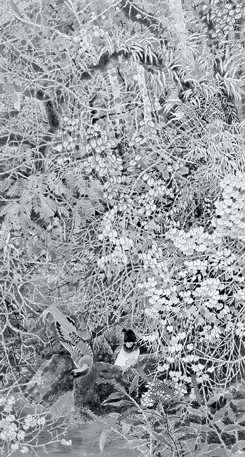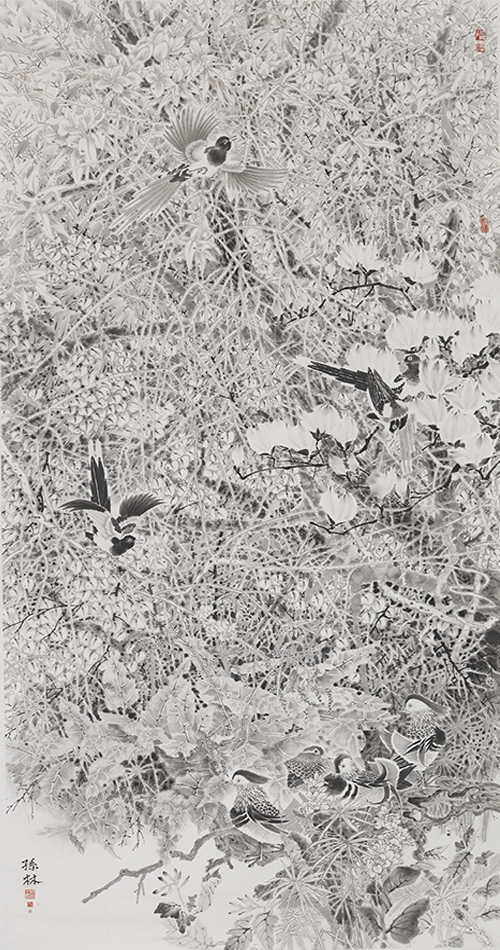 近些年,孙林开始摆脱以前驾轻就熟的习惯画法,朝一种以细密为基本特征的兼工带写的水墨花鸟画发展。果然,这一个特点,让孙林的花鸟画一下子冒了出来。此种他自称的“复杂化”画法,其实应该叫“密体”画法。这是在我们的美术史上唐代以前就有的一种画法。……在中国绘画史上,因为以线造型之故,已有线疏线密之分,本就有以顾恺之、陆探微为代表的密体,和以张僧繇吴道子为代表的疏体,故中唐时的张彦远才说:“若知画有疏密二体,方可议乎画。”……孙林以“复杂化”处理自己的花鸟画,其实恢复的是中国绘画史上的“密体”画传统风格。这或许可看成是孙林此种密体花鸟画受人关注的美术史之内在逻辑。孙林这种现代密体花鸟之创造,不仅在花鸟画样式上出现一新格,其满密生动的画面,也带给自然界一种活色生香勃勃生气之感。当然,密体花鸟结构造型之极度繁密,要在小写意运笔之节奏、速度与韵律上与意笔花鸟笔墨较短长,是有相当难度的。或者说,这是一个不对称的比较。不过,密体花鸟的新范式已经出现,其愈趋完美只是有待时日而已。......